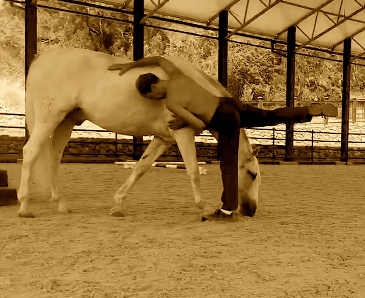 Being With, a quartet for two dancers and two horses, began with a guided meditation drawn from Paula Josa-Jones’ work (2017) and built on the dancers’ knowledge of contact improvisation, which was extended here to include our equine partners. Building on Joanna Mendl Shaw’s work as well, we created a variety of improvisational scores based on the movements and sensations we encountered through tactile and sensory dialogues with the horses, taking cues from their bodies—such as how their ears and eyes moved, or whether they were relaxed or vigilantly attending to unusual noises or movements in our shared environment. Being With was also in part about meeting the horses on their own terms rather than dominating or riding them. We did not consciously direct their actions but rather tried to tune into their body language, letting them guide our movement through sensation and observation.
