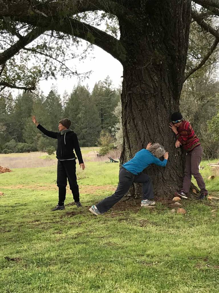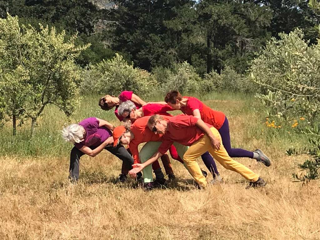A group piece for seven dancers, Murmurations came to life initially through a breathing meditation written by Paula Josa-Jones called “Letting the Breath Breathe Itself” and grew over time as we collectively generated a set of “flocking guidelines” for moving together (see Katz, 2019, Understory Dances). The piece took place in a young olive grove, starting about 100 yards from the audience and ending a few feet away from them.