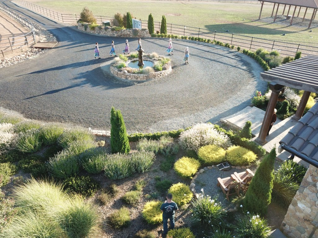 Based on improvisational phrases created by the dancers, this invocation took place around a fountain located at the top of the driveway facing the barn. It gave viewers an opportunity to settle in while taking in the surroundings — fields, hills, water, birds, and wind.